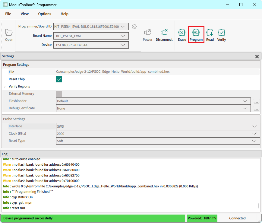 Click Program. ModusToolbox™ Programmer downloads the program file onto the device and displays messages in the Log.