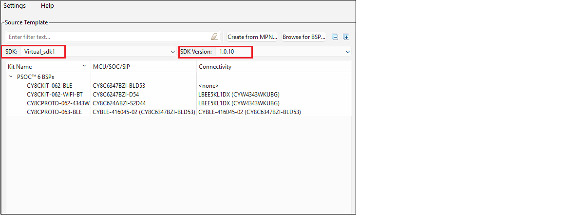 If any virtual SDKs are available to you, the SDK and SDK Version fields display to select one and its version. You can use the Settings tool to specify an SDK that will always be selected by default. A virtual SDK is a list of assets (kits, applications, libraries, etc.) and specific versions of those assets. This setting allows you to filter available BSPs and applications based on the information in those files. It limits the available BSPs, example projects, and libraries to provide a more streamlined development process.
