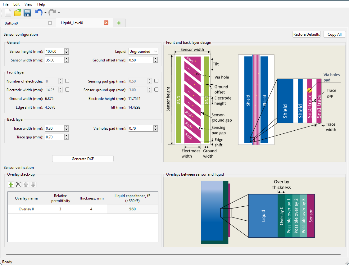 The Sensor Designer tool generates sensor drawings in the *.dxf file format to be imported into PCB layouts. The tool interface contains the parameters description and illustrative images of the sensor drawings. You can add multiple
