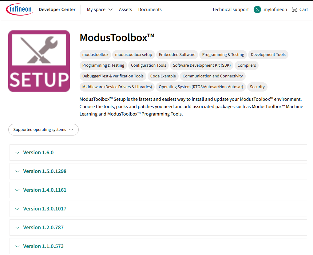 The Setup program is available from the Infineon website: https://softwaretools.infineon.com/tools/com.ifx.tb.tool.modustoolboxsetup