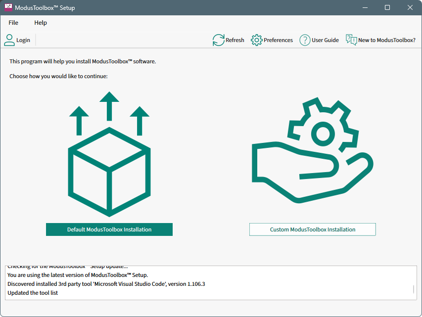 If you do not have any ModusToolbox™ tools package installed, the Setup program opens showing you two options: