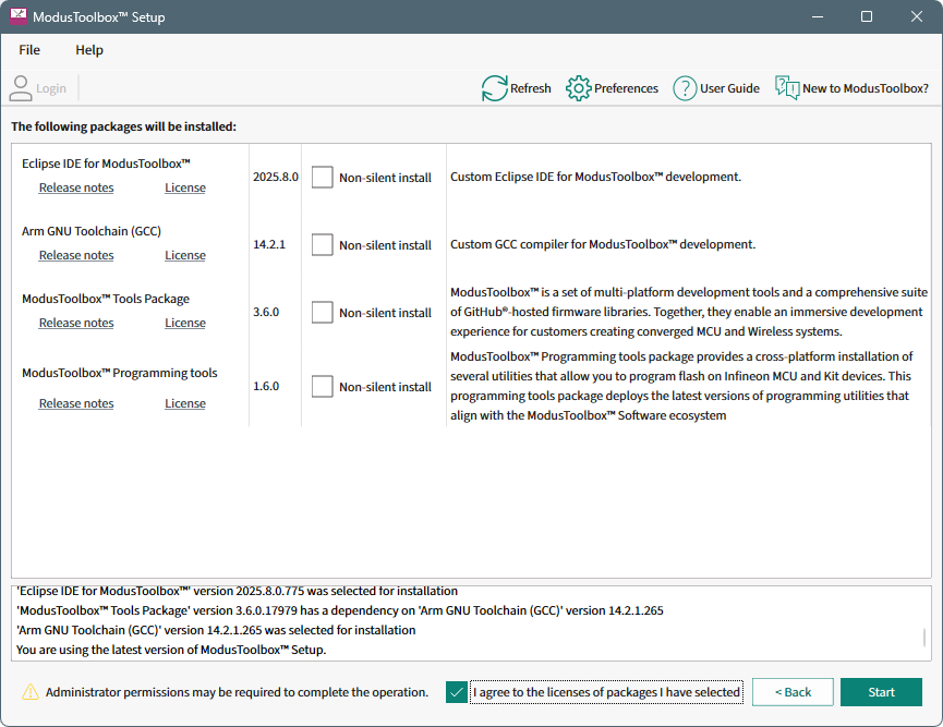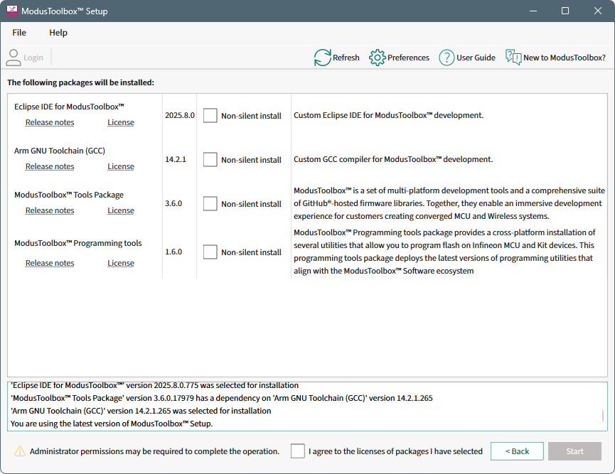 The easiest way to install ModusToolbox™ software is to use the ModusToolbox™ Setup program. After you install it, you need to launch Setup program to view and select various ModusToolbox™ packages to install. As packages are updated to new versions over time, you can then use the Setup program to update your system, and the Setup program will even check to update itself. This section contains the following steps: