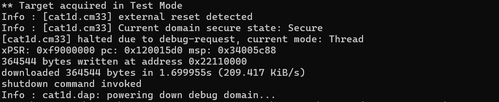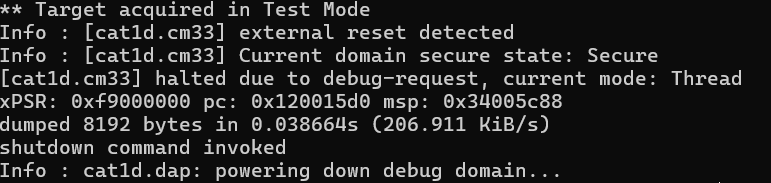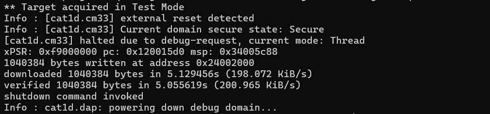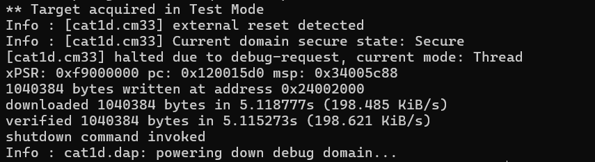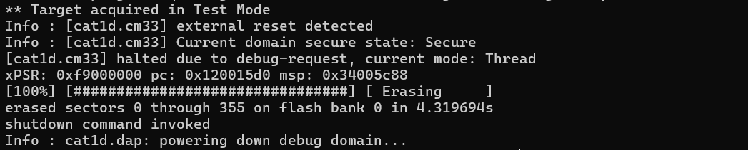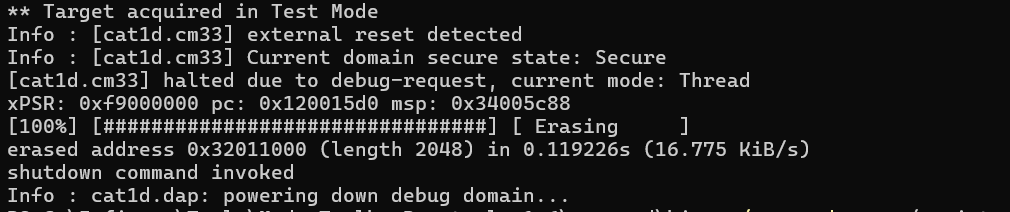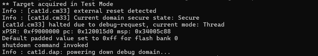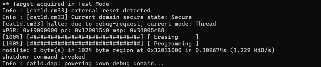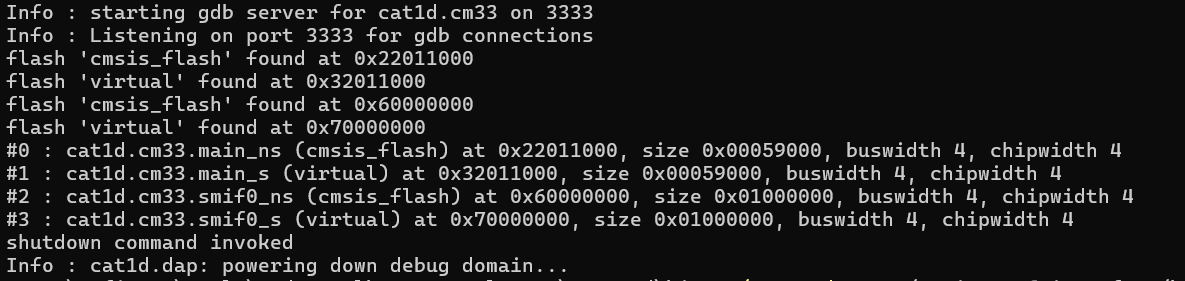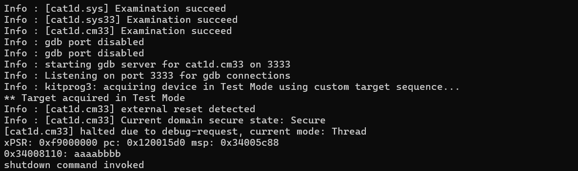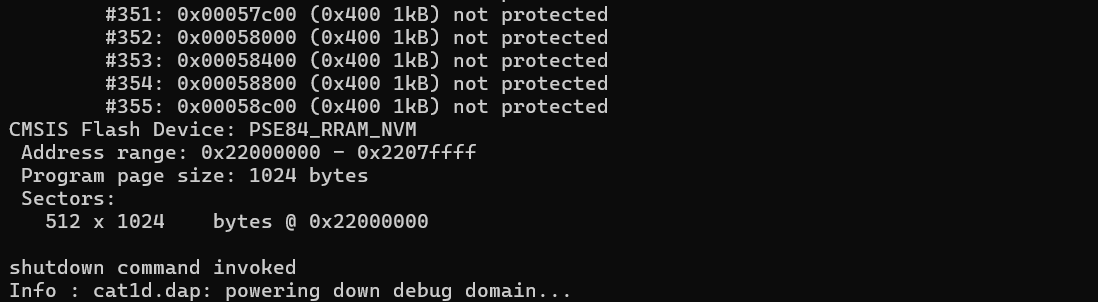 openocd -s scripts -f interface/kitprog3.cfg -f target/infineon/pse84xgxs2.cfg -c "init; show_verify_ranges; add_verify_range cat1d.cm33 0x22011000 0x1000; show_verify_ranges; exit"