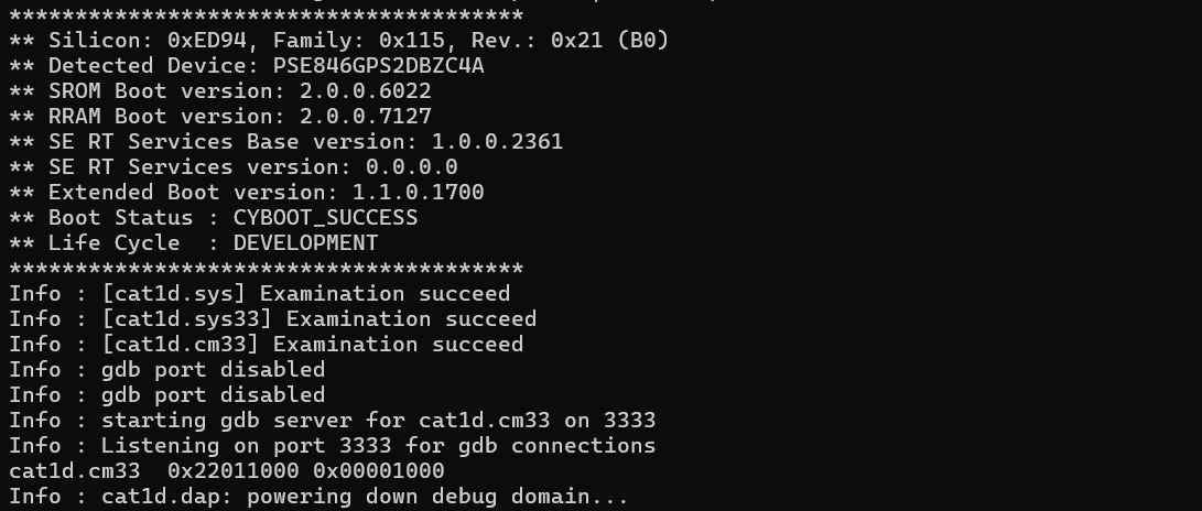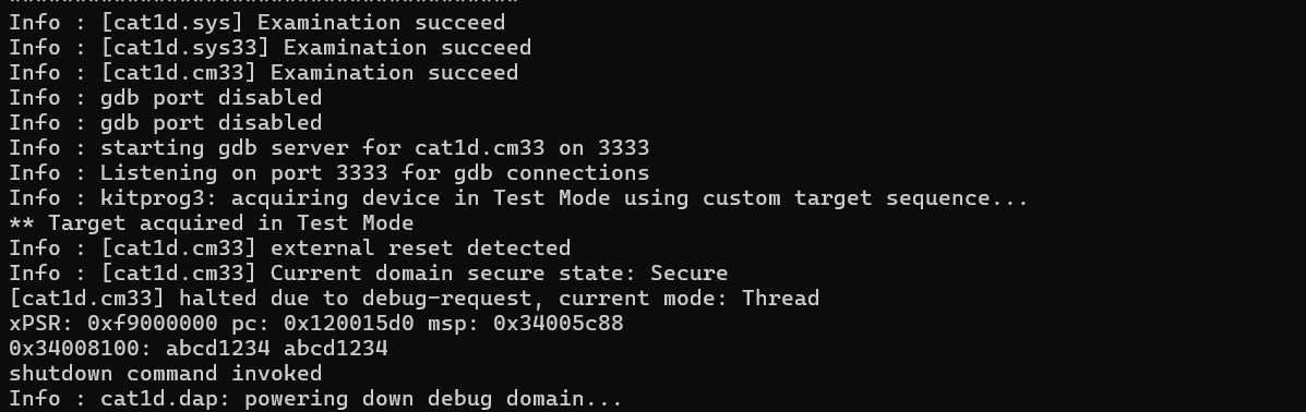 openocd -s ../scripts -f interface/kitprog3.cfg -f target/infineon/pse84xgxs2.cfg -c "targets cat1d.sys; target current"