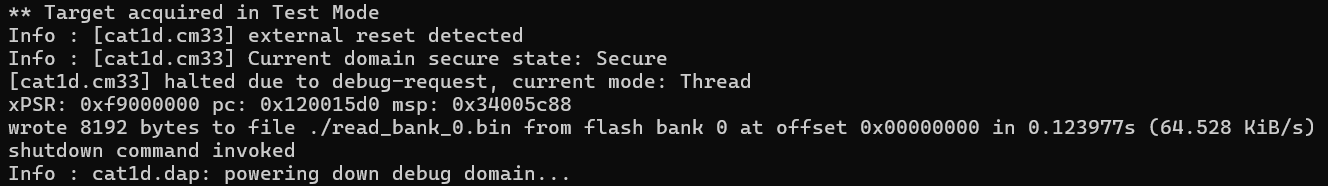 openocd -s ../scripts -f interface/kitprog3.cfg -f target/infineon/pse84xgxs2.cfg -c "init; reset init; flash read_bank 0 read_bank_0.bin 0x0 0x2000; shutdown"