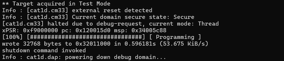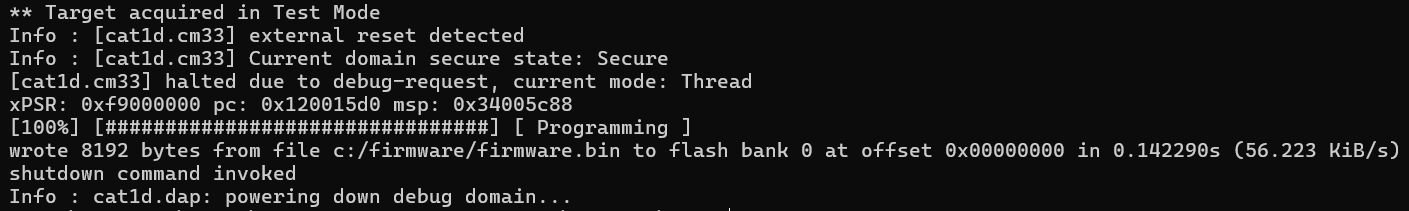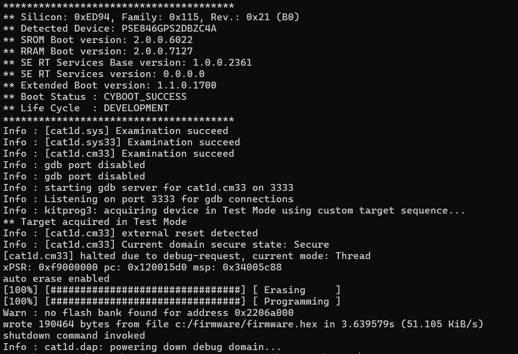 openocd -s ../scripts -f interface/kitprog3.cfg -f target/infineon/pse84xgxs2.cfg -c "init; reset init; load_image c:/firmware/firmware.bin 0x22110000; shutdown"