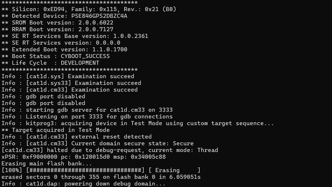 openocd -s ../scripts -f interface/kitprog3.cfg -f target/infineon/pse84xgxs2.cfg -c "init; reset init; flash write_image erase c:/firmware/firmware.hex; shutdown"
