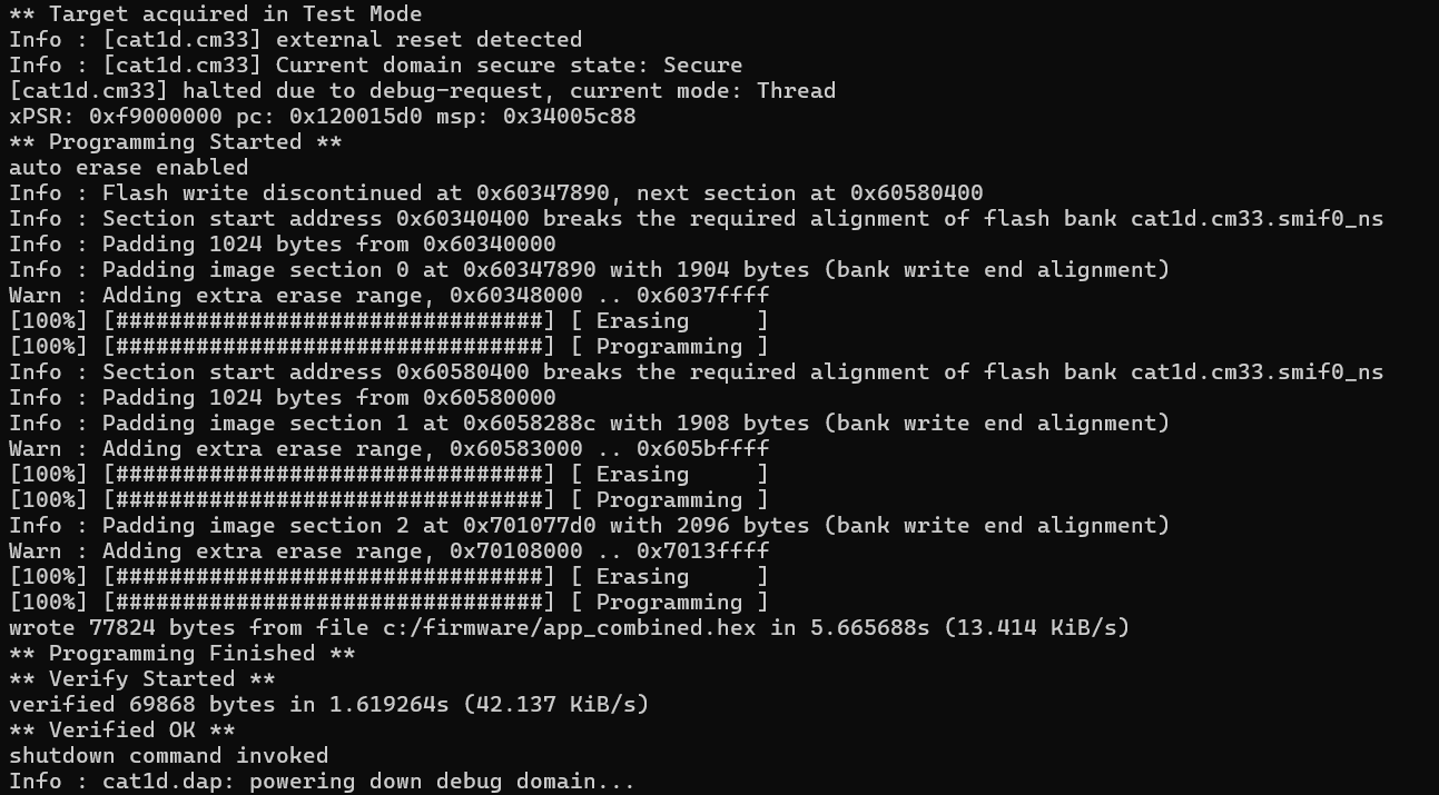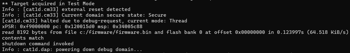 openocd -s ../scripts -f interface/kitprog3.cfg -f target/infineon/pse84xgxs2.cfg -c "init; reset init; flash verify_bank 0 c:/firmware/firmware.bin 0x0; shutdown"