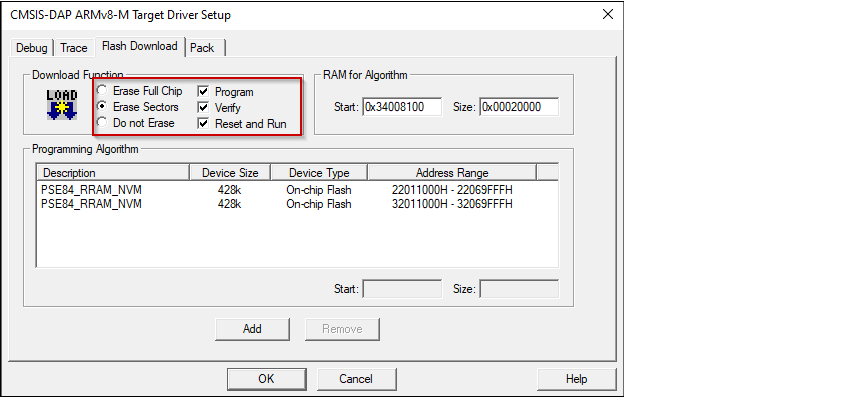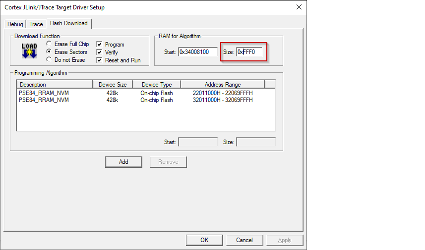 For J-Link, ensure the RAM size for the algorithm is set to 0xFFF0.