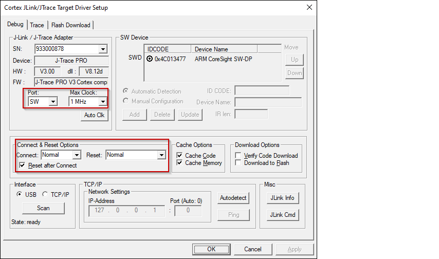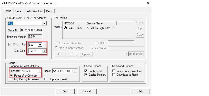 tab, and choose applicable connection options, the configuration settings are different for CMSIS-DAP and J-Link. Refer to the following sections for the applicable options: