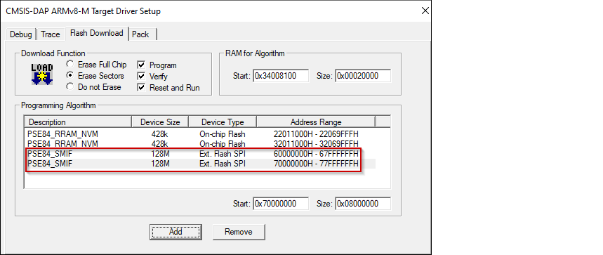 For either driver, if any application (secure CM33, non-secure CM33, or CM55) should be programmed to external memory, two additional instances of flashloaders with name PSE84_SMIF need to be added using the