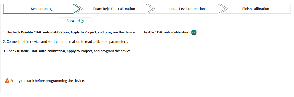 Warning: "Empty the tank before programming the device."