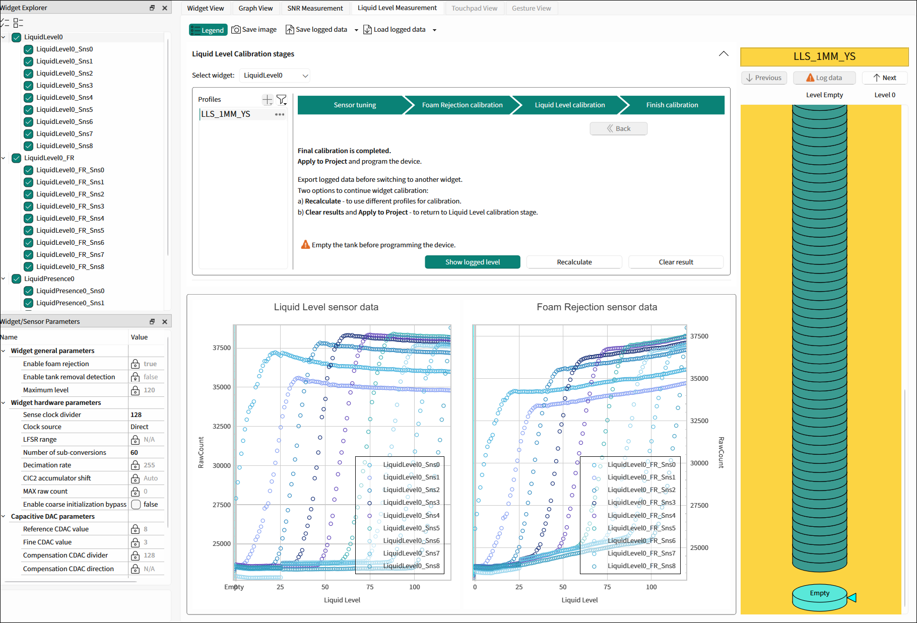 The Liquid Level Calibration pane contains the Profiles tree and the stages to perform the Liquid Level calibration: **Sensor tuning, ****Foam Rejection calibration, ****Liquid Level calibration **, and Final calibration. See Calibration stages for detailed instructions.