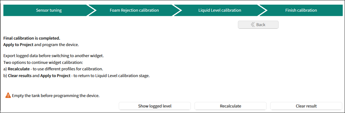 Clear results and ** Apply to Project** - to return to the Liquid Level calibration stage.