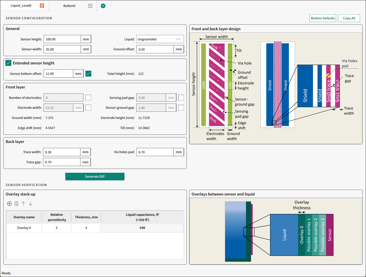 The Liquid Level tab is used to design a liquid level sensor for the preferred application requirements and generate a *.dxf file.