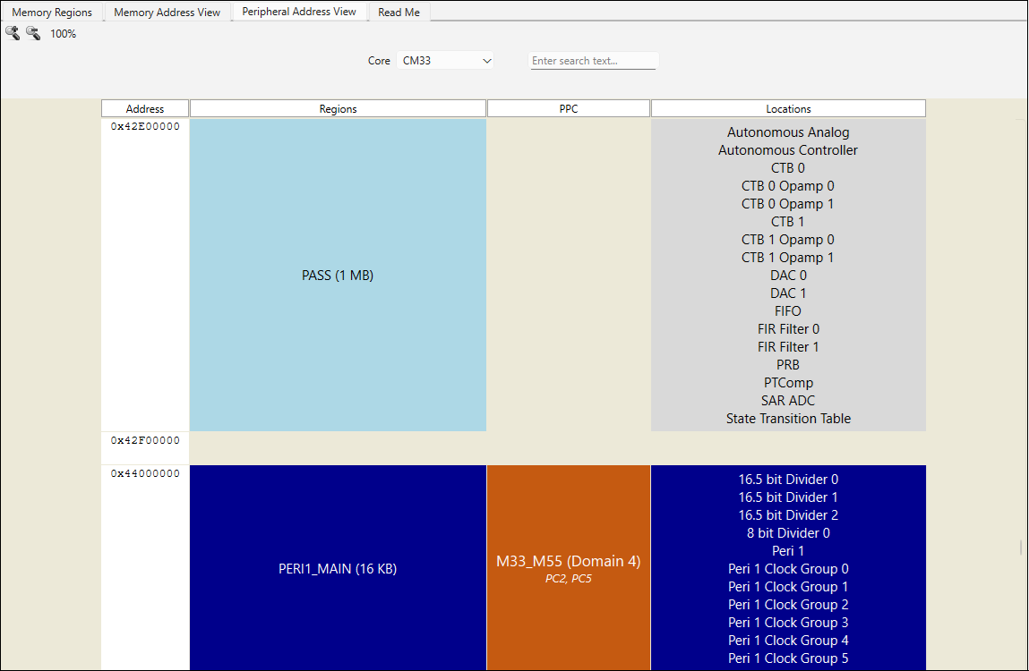 column depicts all of the peripheral regions defined for the device. There is no meaning in the background colors of these regions; the colors simply alternate between two shades of blue for visual contrast.