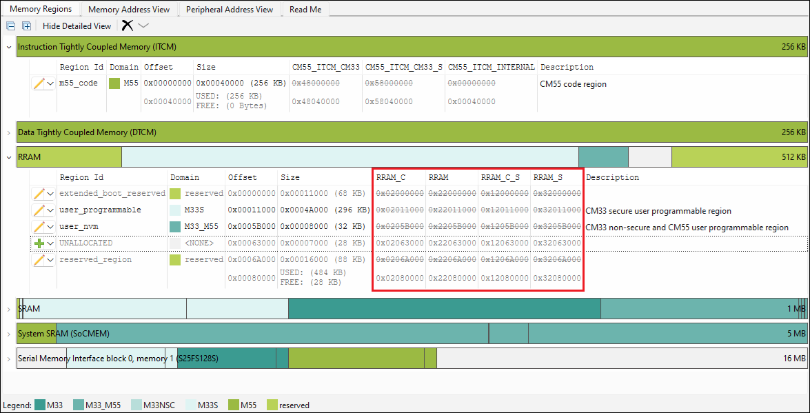 column depicts all the physical memories and external memory reservations for the device, along with the size and capabilities for each. Possible capabilities include Executable, Writable, Readable, Programmable, Nonvolatile, Secure, and Instruction Cache.