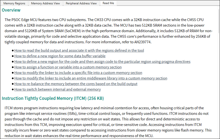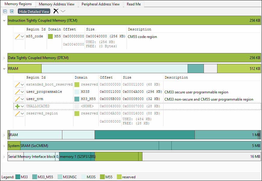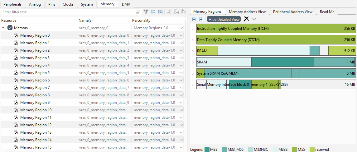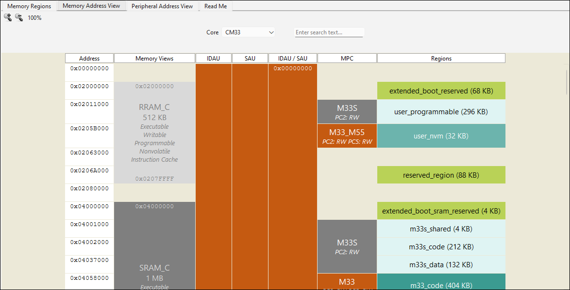tab becomes visible for supported devices to configure and visualize memory regions for each core in the device. Similar to other tabs, there is a