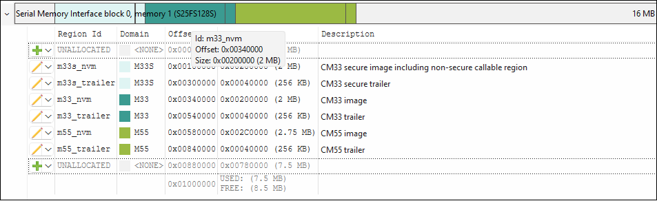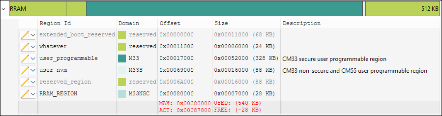 . For each region, the region id and size is shown, and has the same user-configured color coding from the Memory Regions tab.