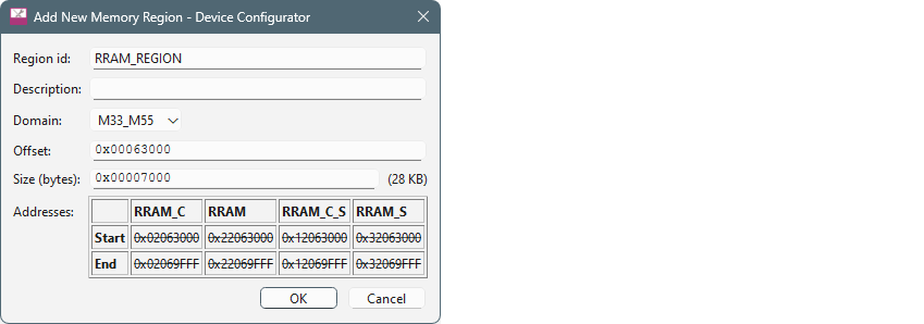 To add an allocation, double-click an unallocated row to open the Add New Memory Region dialog.