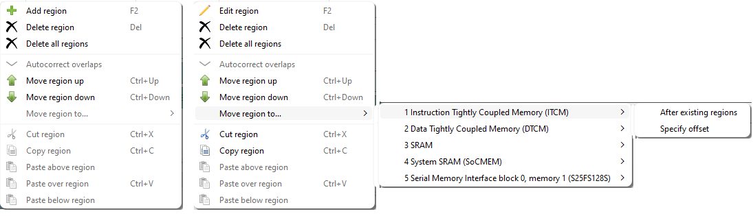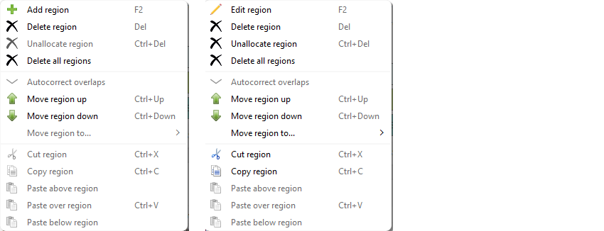 On the context menu, there are various options to move regions, as well as cut, copy, and paste regions.