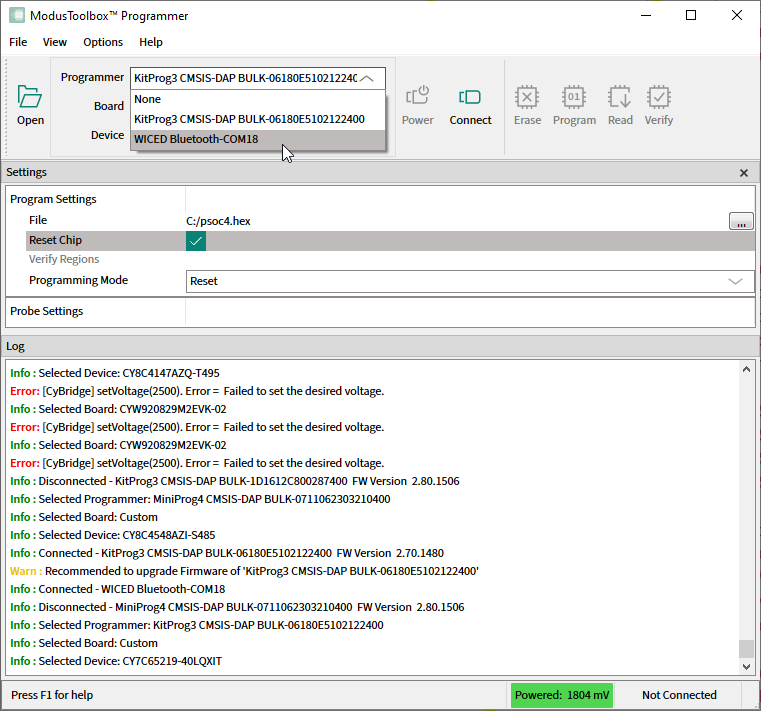 The CYW9M2BASE-43012BT board should be switched to Dual UART mode first, otherwise the WICED Bluetooth programmer will be unavailable in theBoardpull-down menu. To do this, press the hardware 'Mode' button on the Kit, hold it for 3 seconds, then release it.
