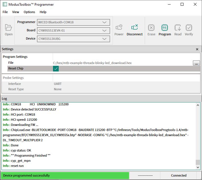 ModusToolbox™ Programmer programs the device and displays various messages in the Log. Then, a message in the Status Bar indicates that the device was programmed successfully or that an error occurred.