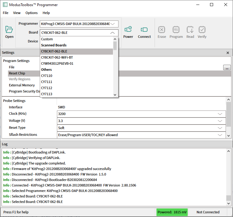 drop-down is populated with the names of the supported KitProg3 Kits.