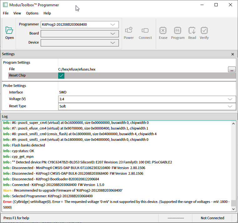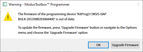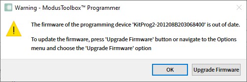 The ModusToolbox™ Programmer application allows you to upgrade KitProg2, KitProg3, and MiniProg4 device firmware.