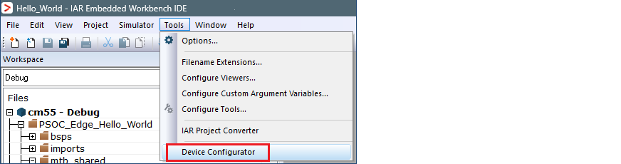 You need to configure IAR Embedded Workbench GUI manually to add Device Configurator to the menu, as follows: