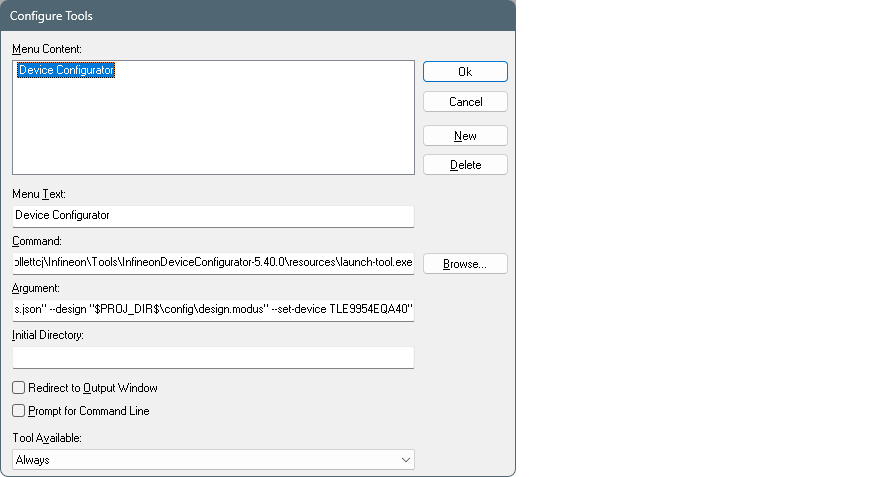 C:\Users\[user-home]\Infineon\Tools\InfineonDeviceConfigurator-[version]\resources\launch-tool.exe --library "C:\Users\[user-home]\IAR-CMSIS-Packs\Infineon\TLE994x_5x_DFP\1.0.0\props.json","C:\Users\[user-home]\IAR-CMSIS-Packs\Infineon\TLE994x_5x_DFP\1.0.0\device-info\device-db\props.json" --design "[IAR EW project path]\config\design.modus" --set-device TLE9954EQA40