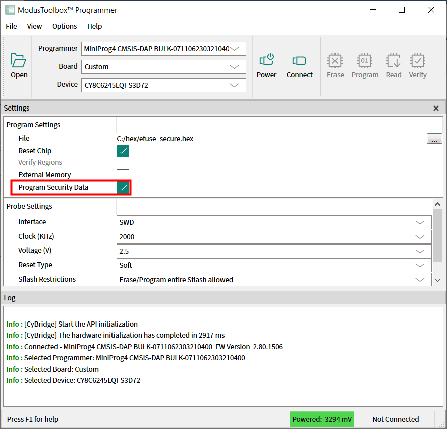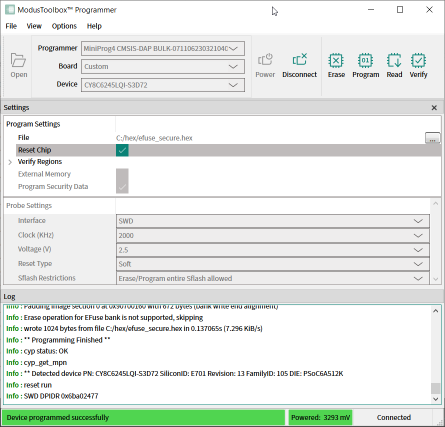 ModusToolbox™ Programmer programs the device and displays various messages in the Log. Then, a message in the Status Bar indicates that the device was programmed successfully or that an error occurred.