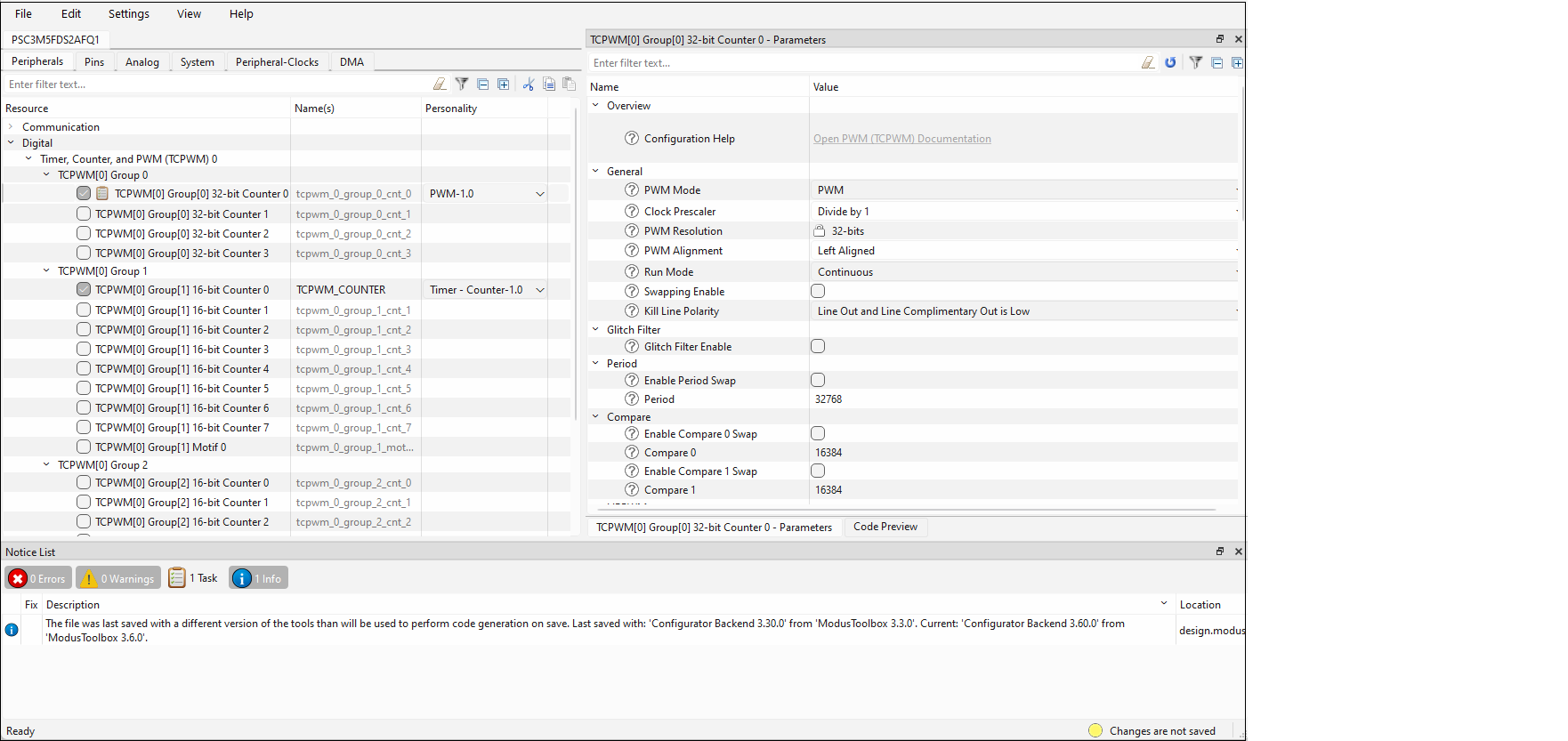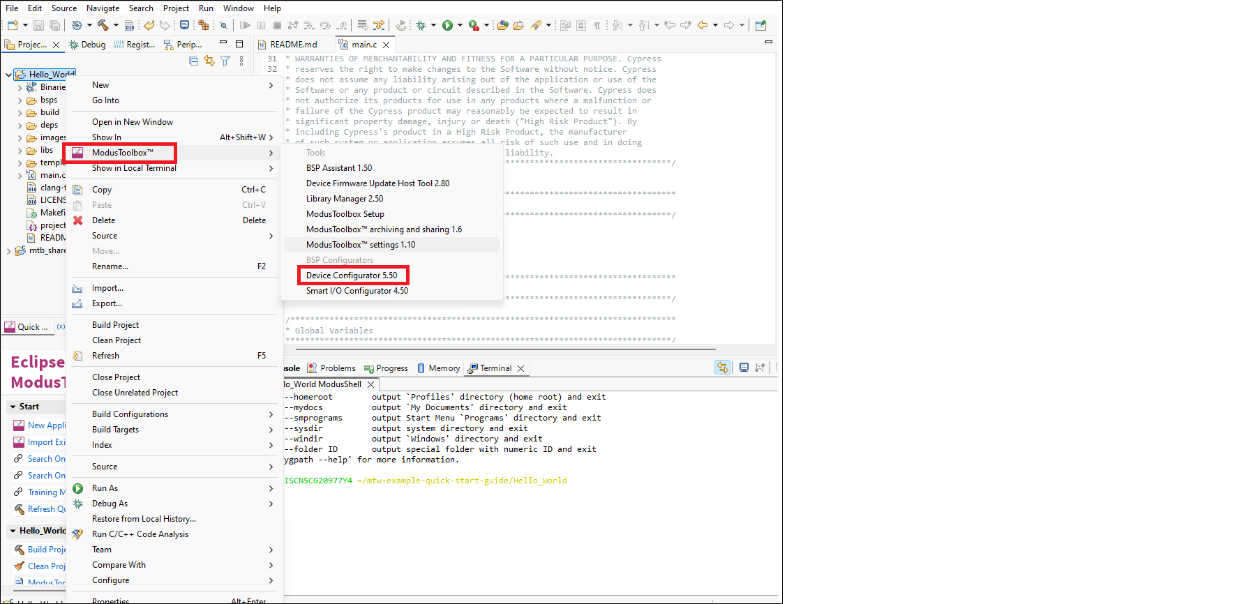 When you launch the Device Configurator from Eclipse, you are opening the project’s design.modus file, which is responsible for holding all of the BSP configuration information. It contains the following: