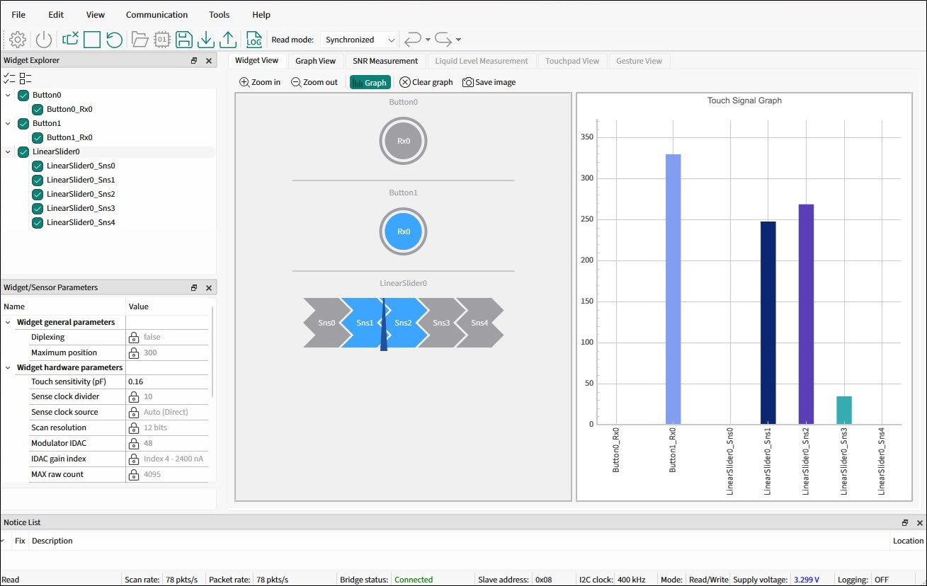 Prior to using the CAPSENSE™ Tuner, create a CAPSENSE™ application and program it into the device. Refer to the CAPSENSE™ Configurator user guide and CAPSENSE™ middleware documentation for help. Your application must contain the CAPSENSE™ Middleware and a communication interface (I2C, UART or RTT). The Tuner works with the KitProg3, MiniProg4, and UART devices.