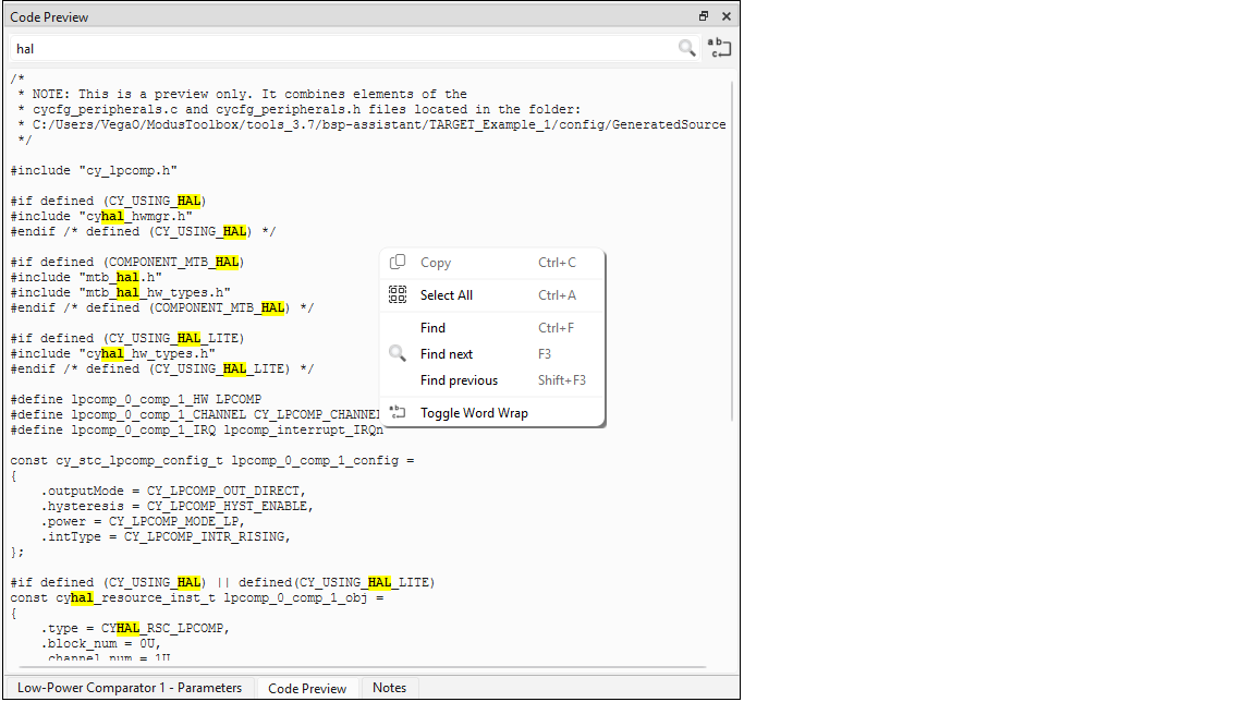 Nearly all resources provide a link to open the Peripheral Driver Library (PDL) documentation to the specific driver. This is the Doxygen-generated HTML file located in the installation directory. To see links to the documentation, simply highlight a resource; you do not need to enable it.