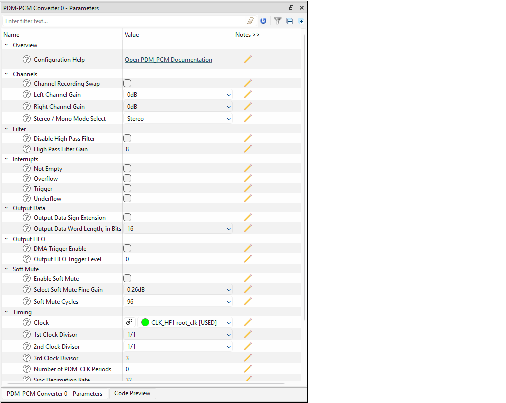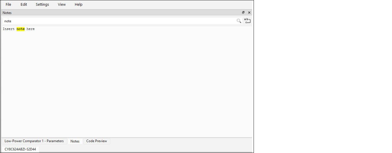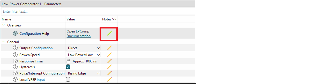 The Parameters pane contains all the parameters for a selected, enabled resource. This pane will show different parameters for each resource, grouped by various categories. For example, the parameters for the TCPWM peripheral are completely different than those for a pin resource. Some resources also provide a link to Launch other configurators. This pane contains a few tools: