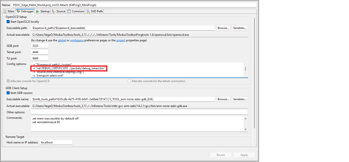 The BootROM on devices such as PSOC™ Control and PSOC™ Edge can temporarily disable access to the core's Access Port (AP). This behavior is determined by the security policy during device provisioning. However, access can be re-enabled using a certificate (debug token). If the debugger identifies that the AP is disabled, it will upload and verify the certificate located in the "./packets/debug_token.bin" file within the current project folder.