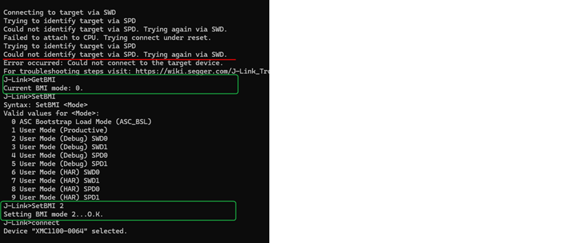 With the on-board J-Link Lite debugger, you can switch the BMI using the SEGGER J-Link Commander tool, which is a part of the J-Link Software Pack that must be installed to use XMC1xxx/4xxx in ModusToolbox™.