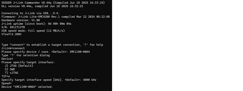 Connect the XMC™ Kit to USB and start J-Link Commander.