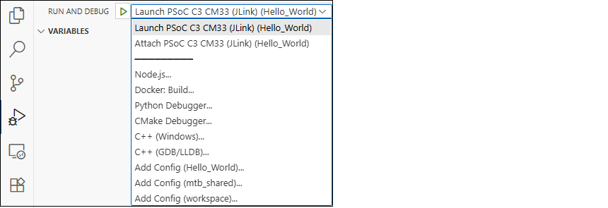 Select the Run and Debug icon in the VS Code Activity Bar, select the Launch PSoC C3 CM33 (KitProg3_Miniprog4) or Launch PSoC C3 CM33 (JLink) Launch Configuration, and click Start Debugging icon or press F5.