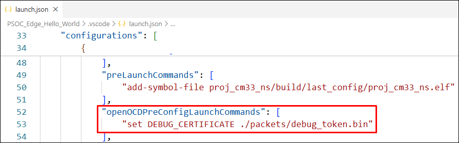 Open the application's launch.json file, and locate the launch configuration. In this case "Launch PSoC C3 CM33 (KitProg3_MiniProg4)".