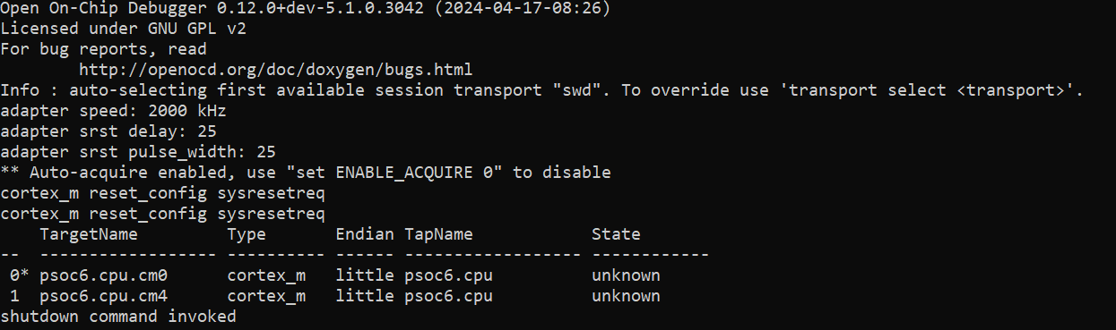 openocd -s ../scripts -f interface/kitprog3.cfg -f target/infineon/cy8c6xxx.cfg -c "targets; shutdown"
