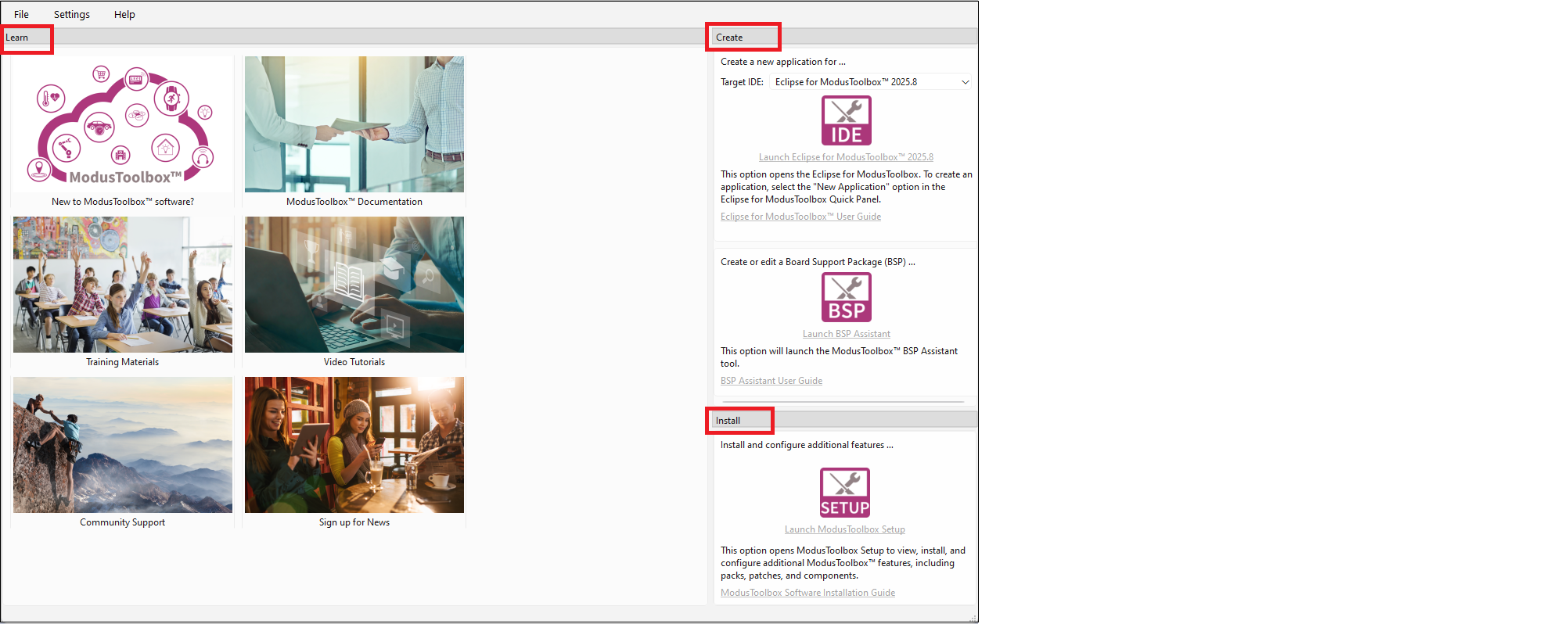for how to download and install ModusToolbox™ software. The Dashboard provides links to various sources of documentation and training materials. It also contains starting points such as: creating a new application, creating/editing a BSP, and installing or launching the ModusToolbox™ Setup program. For more details, refer to the
