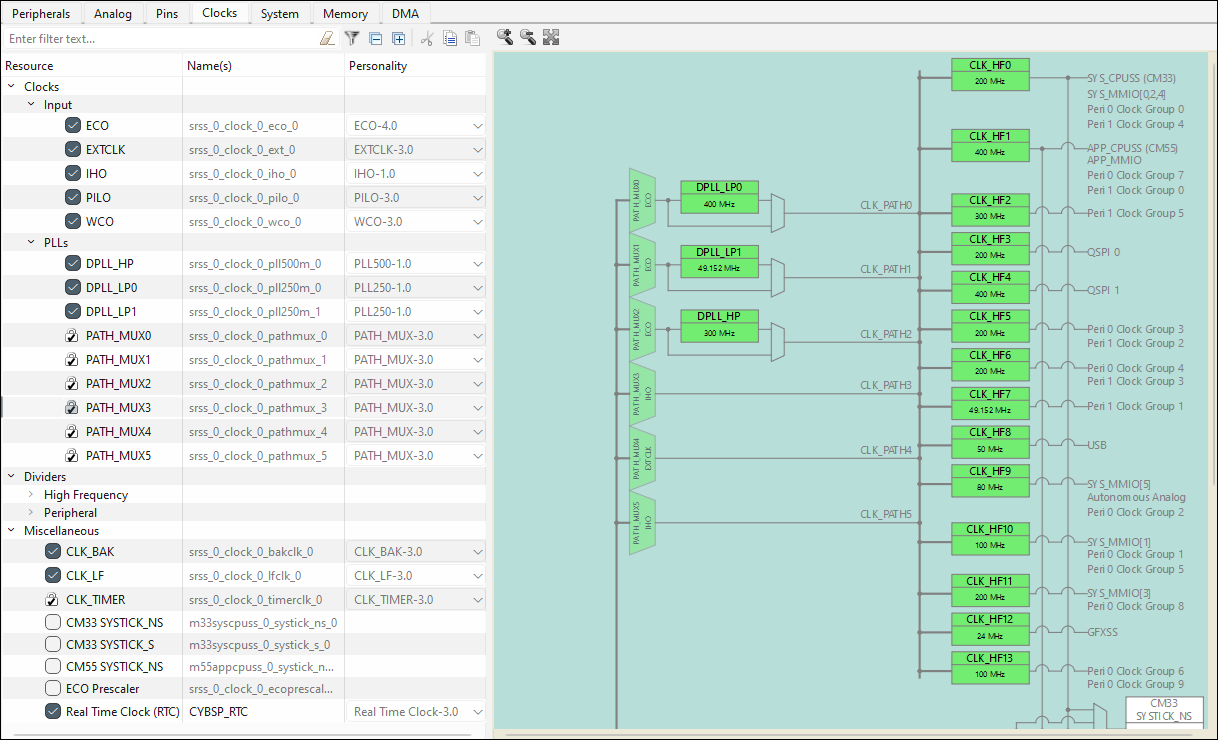 For supported devices, the Peripheral-Clocks tab lists all the clocks in a design used to drive the various peripherals. All available clocks are shown in an expandable tree. The filter box and the hide disabled button above the list of resources allows you to limit the items shown in the tree. This tab allows you to enter one or more Name(s) for the resource. It also shows the selected Personality where applicable.
