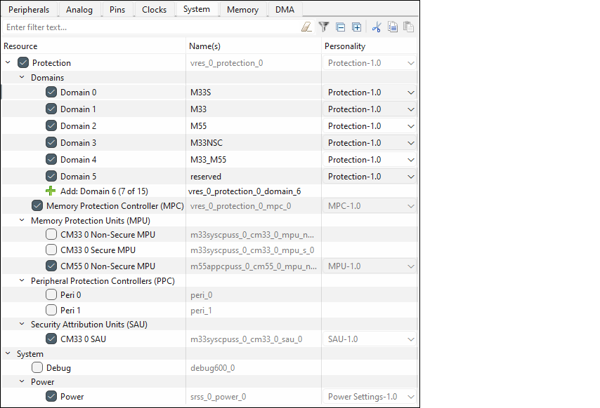 Depending on the device, the System tab provides access to system-level items, such as power management, debug interfaces, and system clocks (for older devices). All available resources are shown in an expandable tree. The filter box and the hide disabled button above the list of resources allows you to limit the items shown in the tree. This tab allows you to enter one or more Name(s) for the resource. It also shows the selected Personality where applicable.