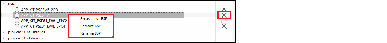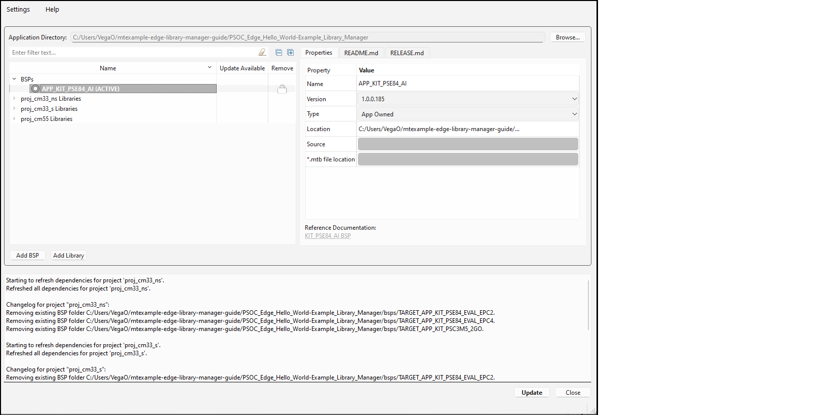 The left side of the Library Manager contains various controls for managing BSPs and libraries: