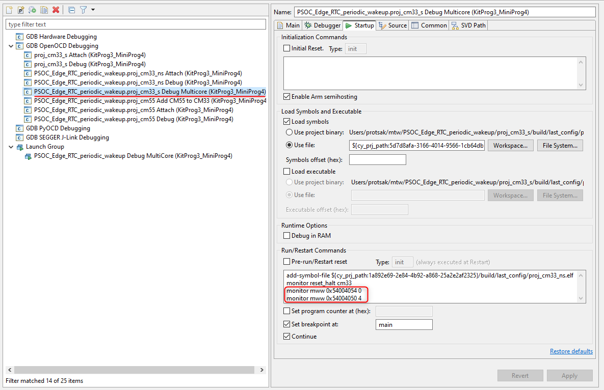 When using multi-core debug CM33 secure applications booting from RRAM (for example PSOC_Edge_RTC_periodic_wakeup), you must configure the launch configuration to add the SMIF IP enabling commands.