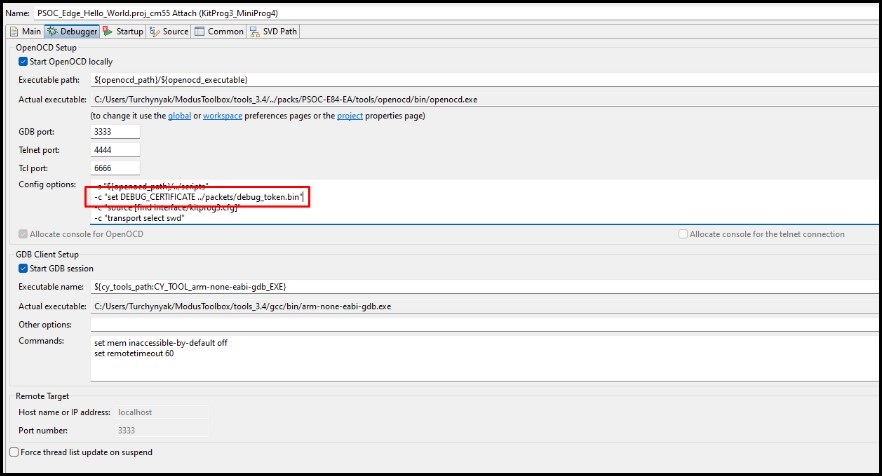 field, insert the following line (after -c "source [find interface/kitprog3.cfg]"):