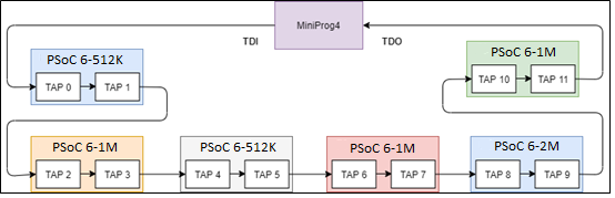 The sample JTAG chain configuration contains six serially-connected PSOC™ MCU targets.