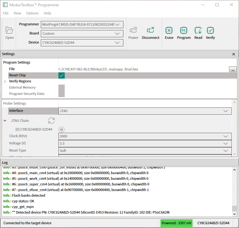 . ModusToolbox™ Programmer communicates with the device and displays various messages in the